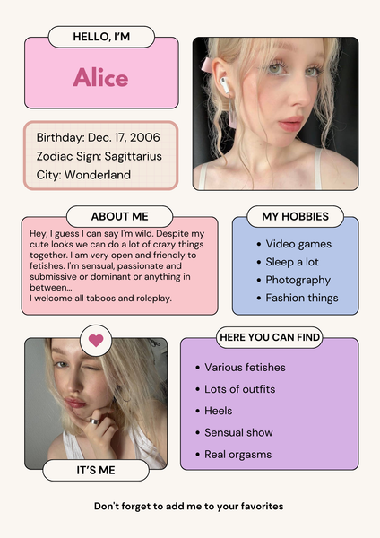 Me llamo Alice, tengo 19 años. Soy una chica común y corriente de Letonia y decidí pasar un rato con ustedes. Soy arquitecta y mi mayor sueño es viajar por el mundo y estudiar la arquitectura de diferentes países. Mi favorito es París.